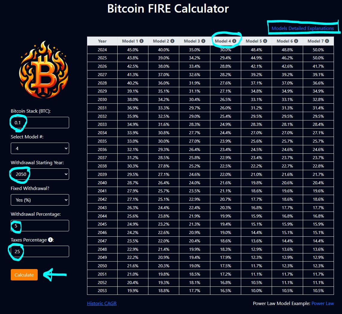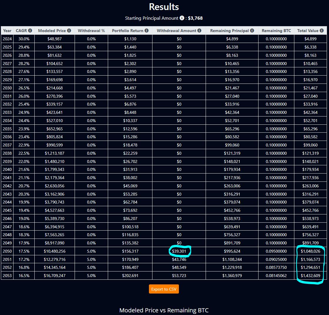 Det interessante er at restbeholdningen fortsetter å øke i verdi, selv om du begynner å ta ut 5% årlig, fordi verdien av Bitcoin øker mer enn det du tar ut. Det årlige uttaket øker derfor også. I dette eksempelet øker det med 5000 USD årlig. Disse modellene beregner hvordan Bitcoin øker i verdi basert på hvordan Bitcoin har vokst i løpet av de 15 første årene. De tar IKKE høyde for at det kan bli hyperinflasjon, noe som gjør at tallene målt i USD vil bli enda høyere, noe som ikke er ensbetydende med økt kjøpekraft, kun uttrykk for at fiat- pengene mister verdi. Disse modellene beregner din kjøpekraft i 2050 målt ut fra dagens kjøpekraft.